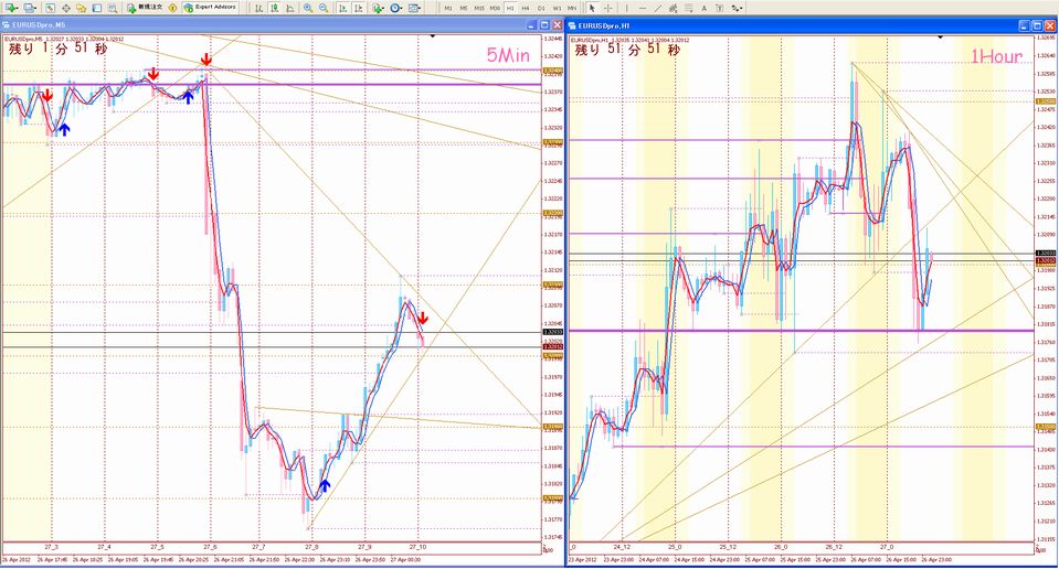 昨夜のEUR急落が止まったポイントが抵抗線で表現されています。(1H 太紫線)